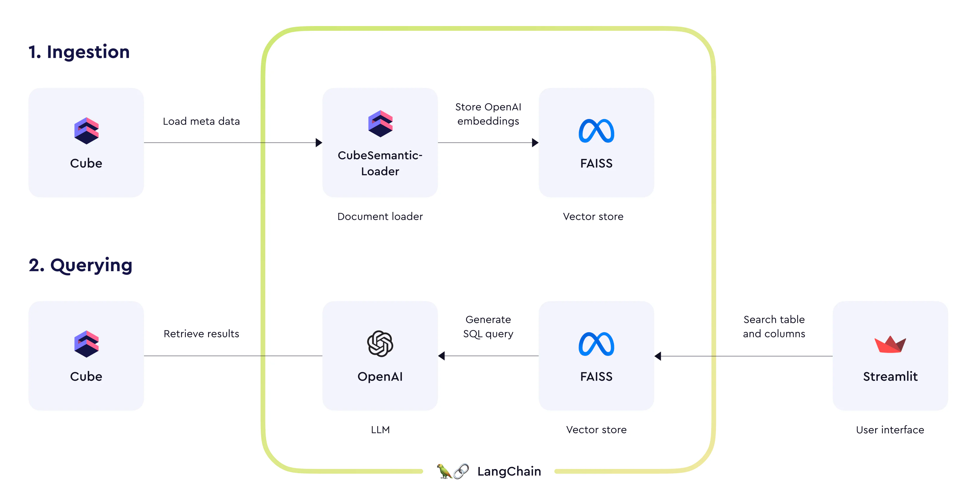 Cube’s integration with LangChain comes as the document loader that is intended to be used to populate a vector database with embeddings derived from the data model. Later, this vector database can be queried to find best-matching entities of the semantic layer. This is useful to match free-form input, e.g., queries in a natural language, with the views and their members in the data model.