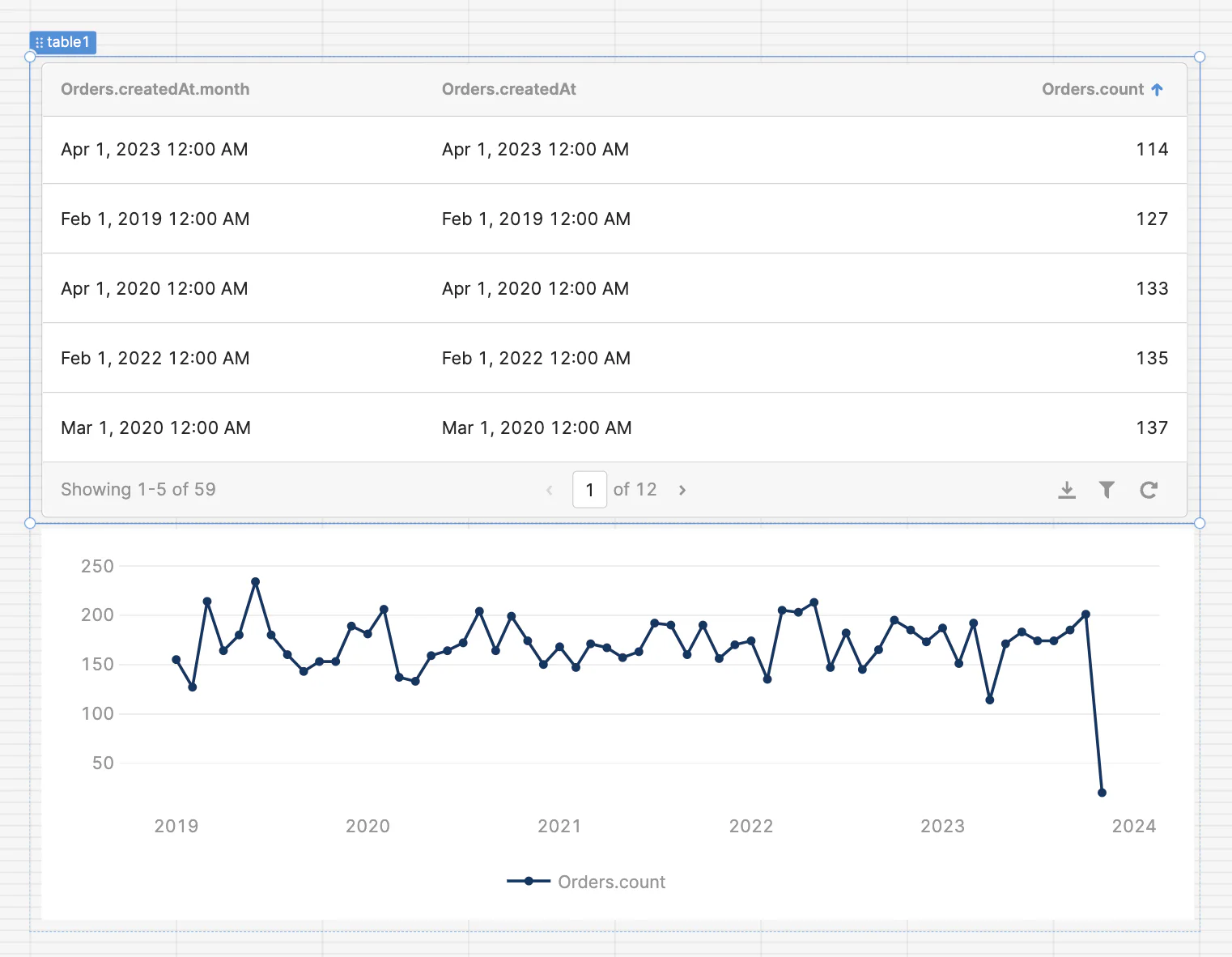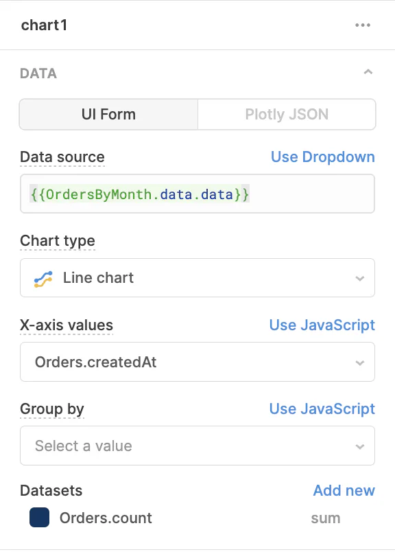 Because the name of the Retool query in the example is OrdersByMonth, using the data binding curly brackets will populate the charts with data from the REST API.