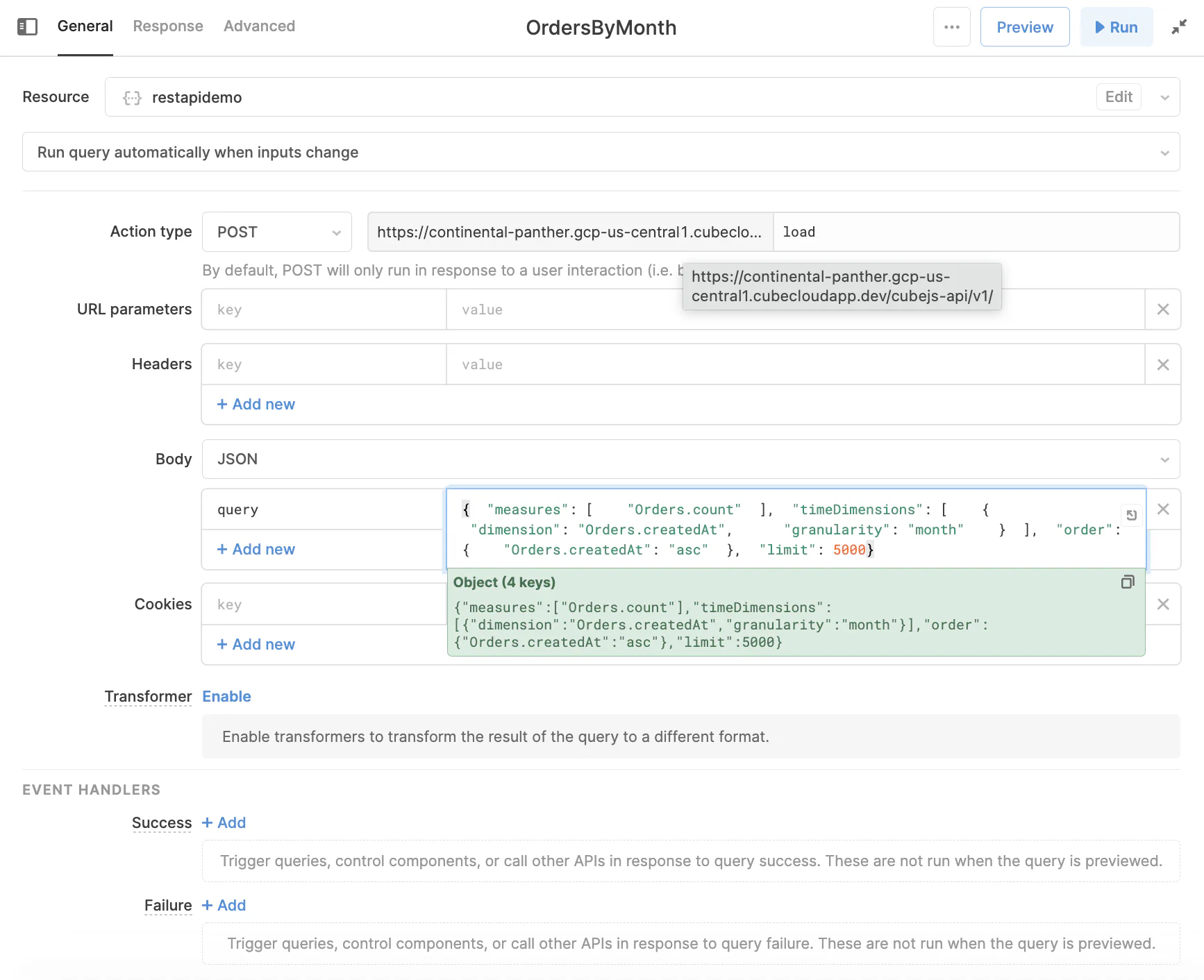 Because the Cube REST API has the format of HOST/cubejs-api/v1, don’t forget to add the /load endpoint to the end of the data source API.