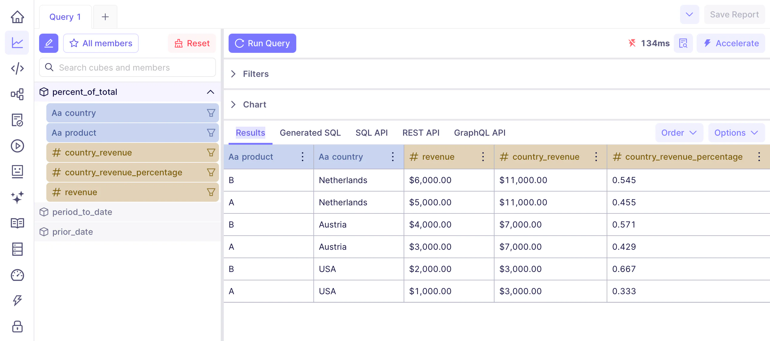 cubes: - name: percent_of_total sql: | SELECT 1 AS id, 1000 AS revenue, 'A' AS product, 'USA' AS country UNION ALL SELECT 2 AS id, 2000 AS revenue, 'B' AS product, 'USA' AS country UNION ALL SELECT 3 AS id, 3000 AS revenue, 'A' AS product, 'Austria' AS country UNION ALL SELECT 4 AS id, 4000 AS revenue, 'B' AS product, 'Austria' AS country UNION ALL SELECT 5 AS id, 5000 AS revenue, 'A' AS product, 'Netherlands' AS country UNION ALL SELECT 6 AS id, 6000 AS revenue, 'B' AS product, 'Netherlands' AS country dimensions: - name: product sql: product type: string - name: country sql: country type: string measures: - name: revenue sql: revenue format: currency type: sum - name: country_revenue multi_stage: true sql: "{revenue}" format: currency type: sum group_by: - country - name: country_revenue_percentage multi_stage: true sql: "{revenue} / NULLIF({country_revenue}, 0)" type: number
