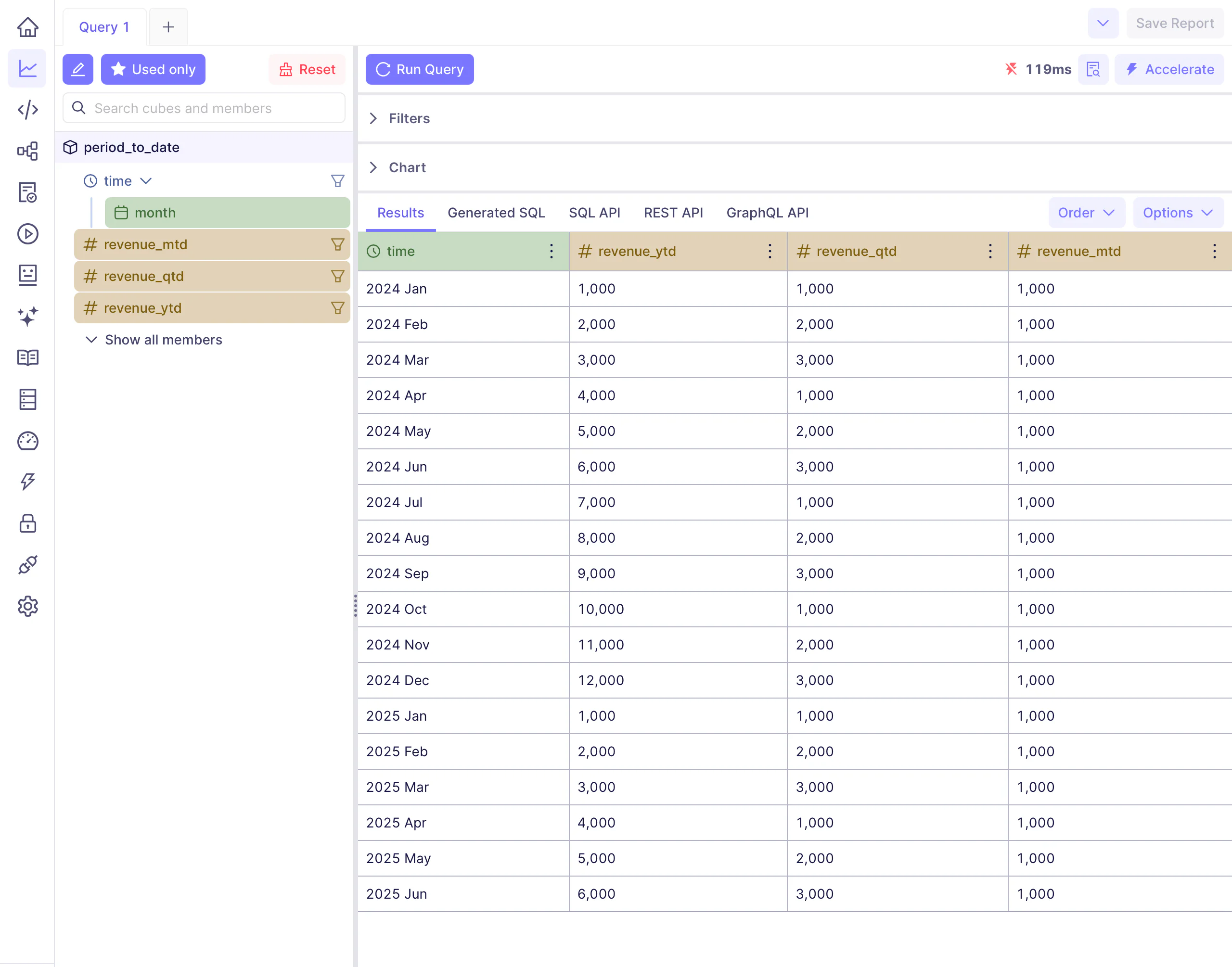 cubes: - name: prior_date sql: | SELECT '2023-04-01'::TIMESTAMP AS time, 1000 AS revenue UNION ALL SELECT '2023-05-01'::TIMESTAMP AS time, 1000 AS revenue UNION ALL SELECT '2023-06-01'::TIMESTAMP AS time, 1000 AS revenue UNION ALL SELECT '2023-07-01'::TIMESTAMP AS time, 1000 AS revenue UNION ALL SELECT '2023-08-01'::TIMESTAMP AS time, 1000 AS revenue UNION ALL SELECT '2023-09-01'::TIMESTAMP AS time, 1000 AS revenue UNION ALL SELECT '2023-10-01'::TIMESTAMP AS time, 1000 AS revenue UNION ALL SELECT '2023-11-01'::TIMESTAMP AS time, 1000 AS revenue UNION ALL SELECT '2023-12-01'::TIMESTAMP AS time, 1000 AS revenue UNION ALL SELECT '2024-01-01'::TIMESTAMP AS time, 1000 AS revenue UNION ALL SELECT '2024-02-01'::TIMESTAMP AS time, 1000 AS revenue UNION ALL SELECT '2024-03-01'::TIMESTAMP AS time, 1000 AS revenue UNION ALL SELECT '2024-04-01'::TIMESTAMP AS time, 1000 AS revenue UNION ALL SELECT '2024-05-01'::TIMESTAMP AS time, 1000 AS revenue UNION ALL SELECT '2024-06-01'::TIMESTAMP AS time, 1000 AS revenue UNION ALL SELECT '2024-07-01'::TIMESTAMP AS time, 1000 AS revenue UNION ALL SELECT '2024-08-01'::TIMESTAMP AS time, 1000 AS revenue UNION ALL SELECT '2024-09-01'::TIMESTAMP AS time, 1000 AS revenue UNION ALL SELECT '2024-10-01'::TIMESTAMP AS time, 1000 AS revenue UNION ALL SELECT '2024-11-01'::TIMESTAMP AS time, 1000 AS revenue UNION ALL SELECT '2024-12-01'::TIMESTAMP AS time, 1000 AS revenue UNION ALL SELECT '2025-01-01'::TIMESTAMP AS time, 1000 AS revenue UNION ALL SELECT '2025-02-01'::TIMESTAMP AS time, 1000 AS revenue UNION ALL SELECT '2025-03-01'::TIMESTAMP AS time, 1000 AS revenue UNION ALL SELECT '2025-04-01'::TIMESTAMP AS time, 1000 AS revenue UNION ALL SELECT '2025-05-01'::TIMESTAMP AS time, 1000 AS revenue UNION ALL SELECT '2025-06-01'::TIMESTAMP AS time, 1000 AS revenue dimensions: - name: time sql: time type: time measures: - name: revenue_ytd sql: revenue type: sum rolling_window: type: to_date granularity: year - name: revenue_qtd sql: revenue type: sum rolling_window: type: to_date granularity: quarter - name: revenue_mtd sql: revenue type: sum rolling_window: type: to_date granularity: month
