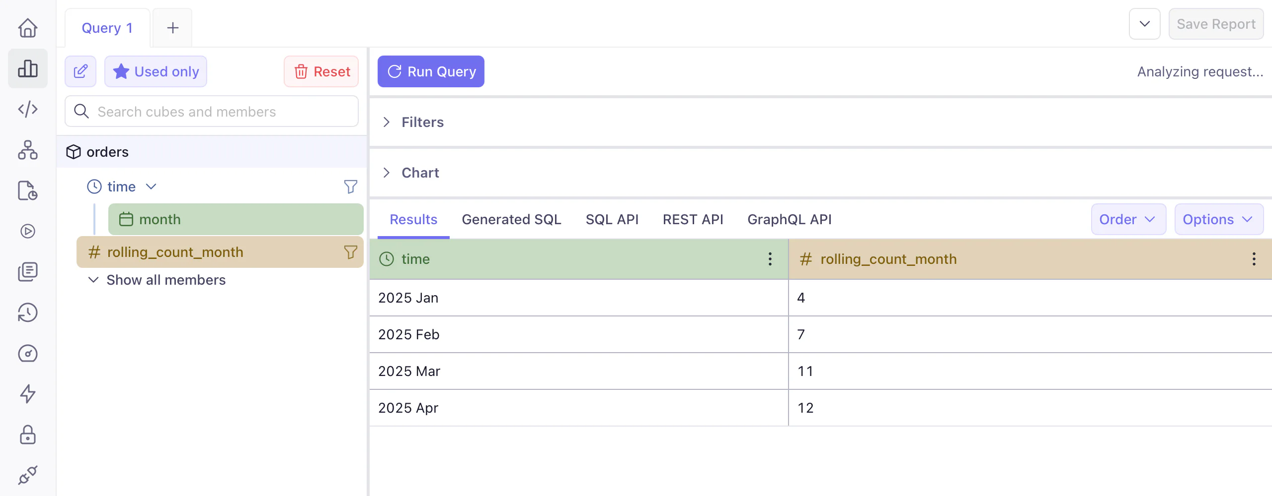cubes: - name: orders sql: | SELECT 1 AS id, '2025-01-01'::TIMESTAMP AS time UNION ALL SELECT 2 AS id, '2025-01-11'::TIMESTAMP AS time UNION ALL SELECT 3 AS id, '2025-01-21'::TIMESTAMP AS time UNION ALL SELECT 4 AS id, '2025-01-31'::TIMESTAMP AS time UNION ALL SELECT 5 AS id, '2025-02-01'::TIMESTAMP AS time UNION ALL SELECT 6 AS id, '2025-02-11'::TIMESTAMP AS time UNION ALL SELECT 7 AS id, '2025-02-21'::TIMESTAMP AS time UNION ALL SELECT 8 AS id, '2025-03-01'::TIMESTAMP AS time UNION ALL SELECT 9 AS id, '2025-03-11'::TIMESTAMP AS time UNION ALL SELECT 10 AS id, '2025-03-21'::TIMESTAMP AS time UNION ALL SELECT 11 AS id, '2025-03-31'::TIMESTAMP AS time UNION ALL SELECT 12 AS id, '2025-04-01'::TIMESTAMP AS time dimensions: - name: time sql: time type: time measures: - name: rolling_count_month sql: id type: count rolling_window: trailing: unbounded