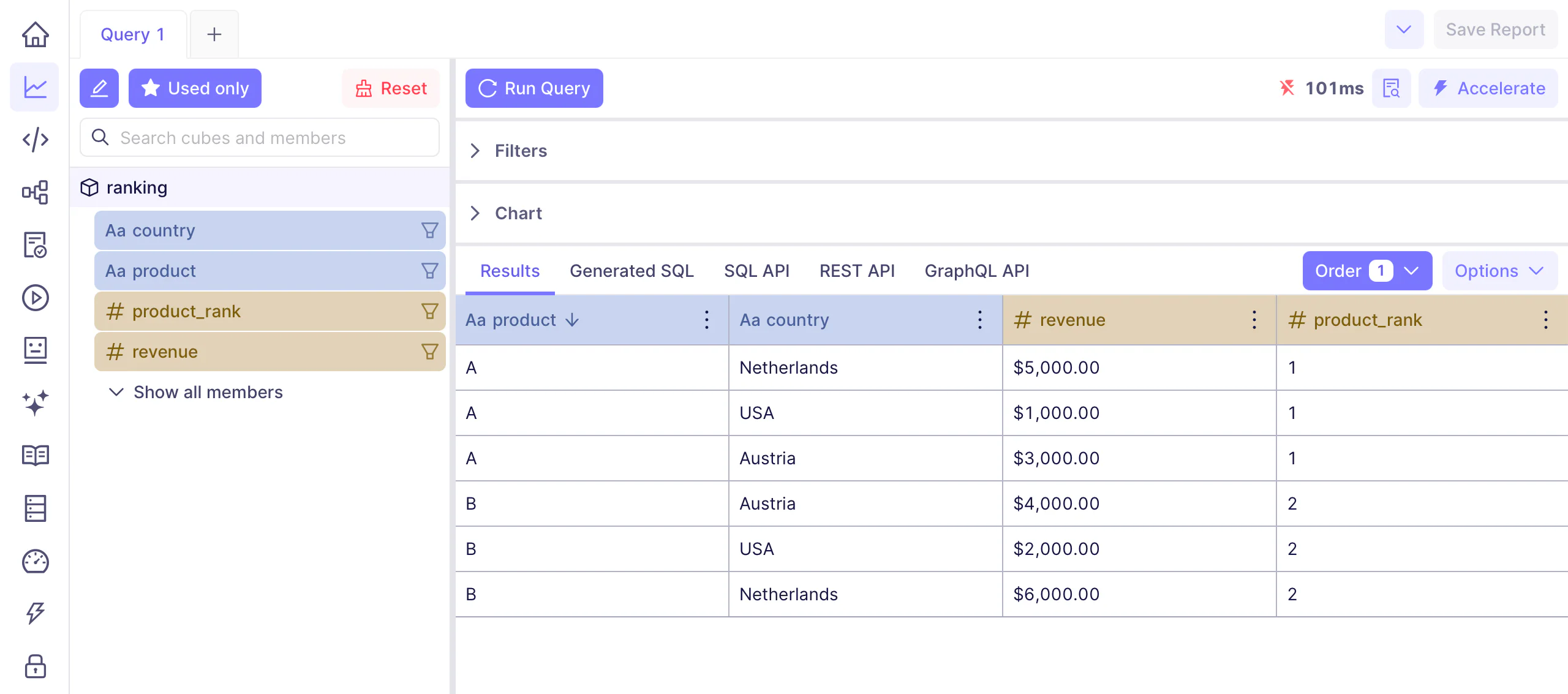 cubes: - name: ranking sql: | SELECT 1 AS id, 1000 AS revenue, 'A' AS product, 'USA' AS country UNION ALL SELECT 2 AS id, 2000 AS revenue, 'B' AS product, 'USA' AS country UNION ALL SELECT 3 AS id, 3000 AS revenue, 'A' AS product, 'Austria' AS country UNION ALL SELECT 4 AS id, 4000 AS revenue, 'B' AS product, 'Austria' AS country UNION ALL SELECT 5 AS id, 5000 AS revenue, 'A' AS product, 'Netherlands' AS country UNION ALL SELECT 6 AS id, 6000 AS revenue, 'B' AS product, 'Netherlands' AS country dimensions: - name: product sql: product type: string - name: country sql: country type: string measures: - name: revenue sql: revenue format: currency type: sum - name: product_rank multi_stage: true order_by: - sql: "{revenue}" dir: asc reduce_by: - product type: rank