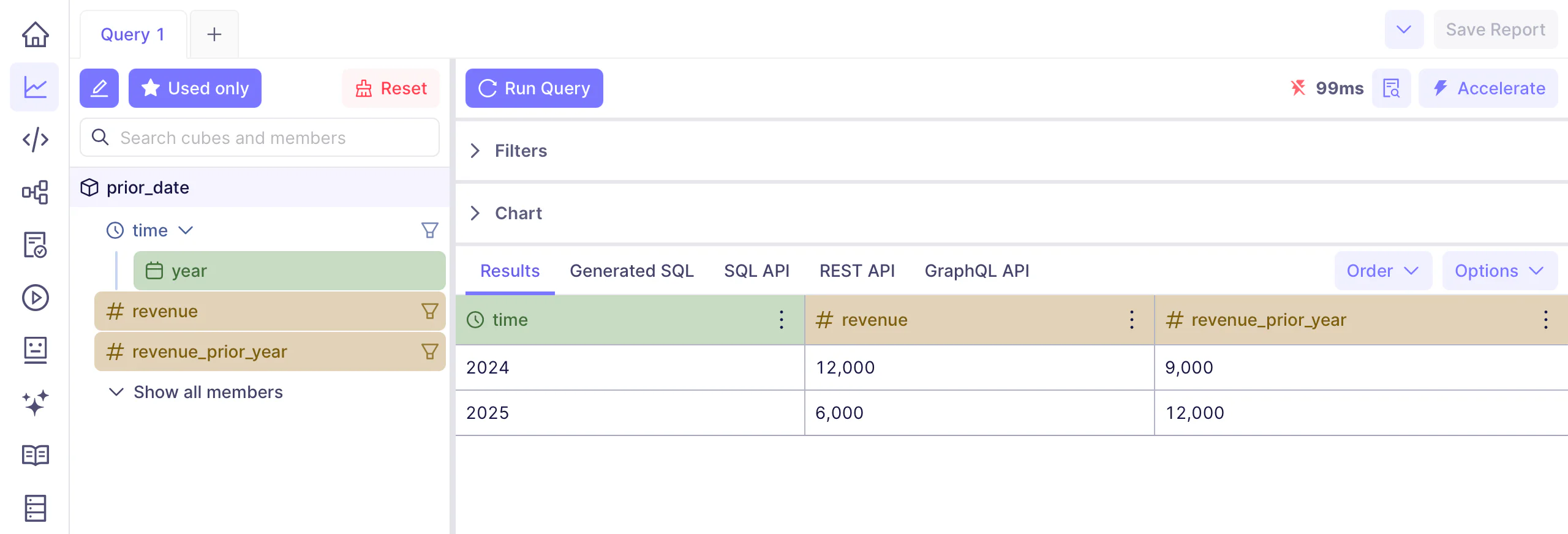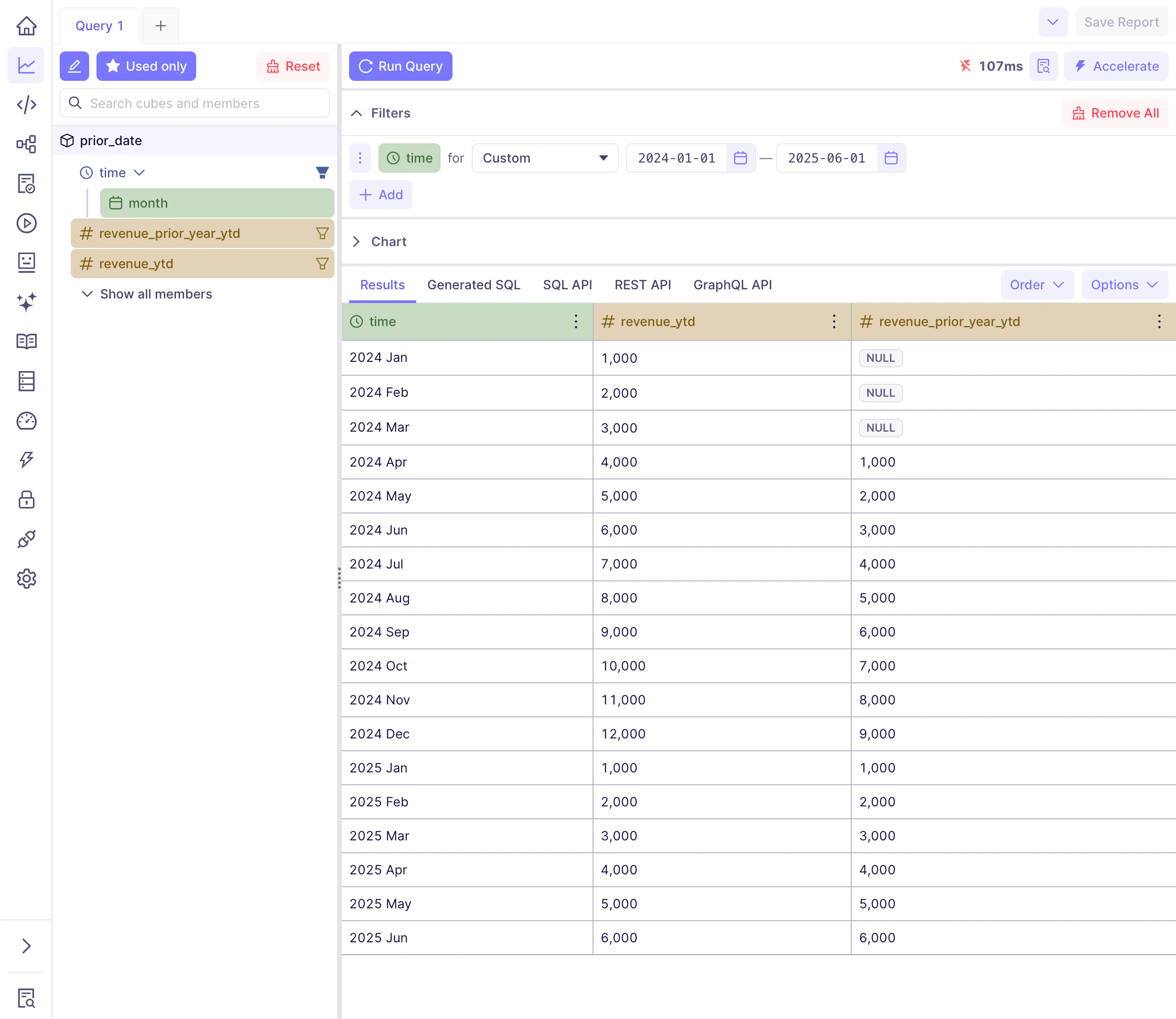 cubes: - name: prior_date sql: | SELECT '2023-04-01'::TIMESTAMP AS time, 1000 AS revenue UNION ALL SELECT '2023-05-01'::TIMESTAMP AS time, 1000 AS revenue UNION ALL SELECT '2023-06-01'::TIMESTAMP AS time, 1000 AS revenue UNION ALL SELECT '2023-07-01'::TIMESTAMP AS time, 1000 AS revenue UNION ALL SELECT '2023-08-01'::TIMESTAMP AS time, 1000 AS revenue UNION ALL SELECT '2023-09-01'::TIMESTAMP AS time, 1000 AS revenue UNION ALL SELECT '2023-10-01'::TIMESTAMP AS time, 1000 AS revenue UNION ALL SELECT '2023-11-01'::TIMESTAMP AS time, 1000 AS revenue UNION ALL SELECT '2023-12-01'::TIMESTAMP AS time, 1000 AS revenue UNION ALL SELECT '2024-01-01'::TIMESTAMP AS time, 1000 AS revenue UNION ALL SELECT '2024-02-01'::TIMESTAMP AS time, 1000 AS revenue UNION ALL SELECT '2024-03-01'::TIMESTAMP AS time, 1000 AS revenue UNION ALL SELECT '2024-04-01'::TIMESTAMP AS time, 1000 AS revenue UNION ALL SELECT '2024-05-01'::TIMESTAMP AS time, 1000 AS revenue UNION ALL SELECT '2024-06-01'::TIMESTAMP AS time, 1000 AS revenue UNION ALL SELECT '2024-07-01'::TIMESTAMP AS time, 1000 AS revenue UNION ALL SELECT '2024-08-01'::TIMESTAMP AS time, 1000 AS revenue UNION ALL SELECT '2024-09-01'::TIMESTAMP AS time, 1000 AS revenue UNION ALL SELECT '2024-10-01'::TIMESTAMP AS time, 1000 AS revenue UNION ALL SELECT '2024-11-01'::TIMESTAMP AS time, 1000 AS revenue UNION ALL SELECT '2024-12-01'::TIMESTAMP AS time, 1000 AS revenue UNION ALL SELECT '2025-01-01'::TIMESTAMP AS time, 1000 AS revenue UNION ALL SELECT '2025-02-01'::TIMESTAMP AS time, 1000 AS revenue UNION ALL SELECT '2025-03-01'::TIMESTAMP AS time, 1000 AS revenue UNION ALL SELECT '2025-04-01'::TIMESTAMP AS time, 1000 AS revenue UNION ALL SELECT '2025-05-01'::TIMESTAMP AS time, 1000 AS revenue UNION ALL SELECT '2025-06-01'::TIMESTAMP AS time, 1000 AS revenue dimensions: - name: time sql: time type: time measures: - name: revenue sql: revenue type: sum - name: revenue_ytd sql: revenue type: sum rolling_window: type: to_date granularity: year - name: revenue_prior_year multi_stage: true sql: "{revenue}" type: number time_shift: - time_dimension: time interval: 1 year type: prior - name: revenue_prior_year_ytd multi_stage: true sql: "{revenue_ytd}" type: number time_shift: - time_dimension: time interval: 1 year type: prior